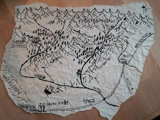 Bei der Karte der Freilande habe ich nur den kleinen Teil um die Zitadelle und Aslov dargestellt. Es sind keine Entfernungsangaben eingezeichnet und sie sind nicht maßstabsgetreu. Begründung hierfür war, dass sie nun mal nichts Besseres kriegen konnten. Sie konnten sich dann natürlich von NSCs noch Informationen erfragen wie „Wie weit ist es von Aslov zur oberen Wache?“ und haben dann eine Antwort in Tagesreisen erhalten. Somit konnten sie ungefähr daraus schließen, welches Verhältnis die Karte darstellt. Kurz gesagt: die schlechte Qualität der Karte war ein bewusstes Spielelement. Als Schriftart habe ich eine selbst erstellte Pseudo-Runenschrift verwendet, da Hellfrost in einem nordischen Hintergrund spielt, grob vergleichbar mit Skyrim.