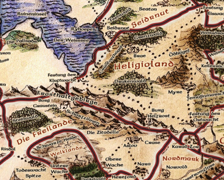 Bei der Karte der Freilande habe ich nur den kleinen Teil um die Zitadelle und Aslov dargestellt. Es sind keine Entfernungsangaben eingezeichnet und sie sind nicht maßstabsgetreu. Begründung hierfür war, dass sie nun mal nichts Besseres kriegen konnten. Sie konnten sich dann natürlich von NSCs noch Informationen erfragen wie „Wie weit ist es von Aslov zur oberen Wache?“ und haben dann eine Antwort in Tagesreisen erhalten. Somit konnten sie ungefähr daraus schließen, welches Verhältnis die Karte darstellt. Kurz gesagt: die schlechte Qualität der Karte war ein bewusstes Spielelement. Als Schriftart habe ich eine selbst erstellte Pseudo-Runenschrift verwendet, da Hellfrost in einem nordischen Hintergrund spielt, grob vergleichbar mit Skyrim.