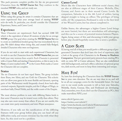 Die Charaktere aus der Warhammer Fantasy Rollenspiel Einsteigerbox sind absolut cool geschrieben. Ihre Hintergründe sind toll ausgearbeitet, die Faltblätter genial gemacht und die Bilder der Gruppe tauchen im Grundregelwerk und Folgepublikationen (beispielsweise Rauhe Tage Harte Nächte Cover, Der Innere Feind Cover) immer wieder auf.