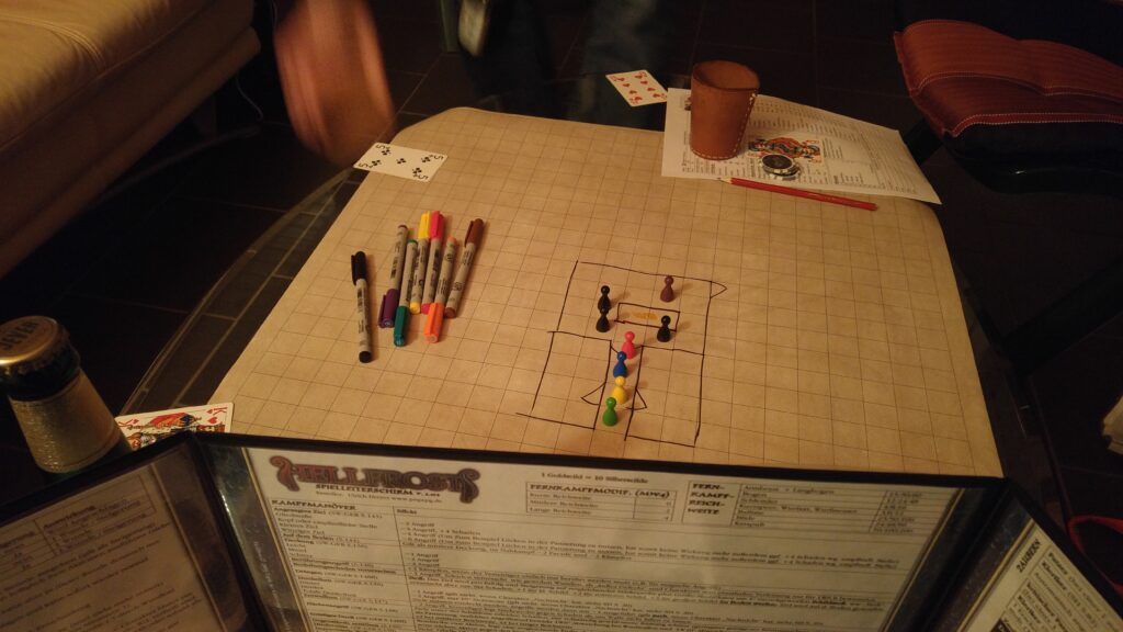 Mit Virtual Tabletop-Lösungen wie roll20, FoundryVTT, D&D Beyond usw. kann man auch vor Ort spielen. Die Systeme bieten Lösungen für Multisession, bei der ein User alle Charaktere steuern kann oder es bringt sich jeder ein Tablet oder Laptop mit. Ich hatte zu diesem Zwecke sogar mal einen Spieltisch gebaut, aus einem rechteckigen Wohnzimmertisch mit Glasplatte und einem 40″ Fernseher, den ich unter die Glasplatte gelegt habe. Ich persönlich bin kein Fan (mehr) von digitalen Medien bei einer Tischrollenspielsitzung. Meine Wertschätzung gilt Stift und Papier und handbemalten Figuren. Aber das ist halt meine persönliche Vorliebe.