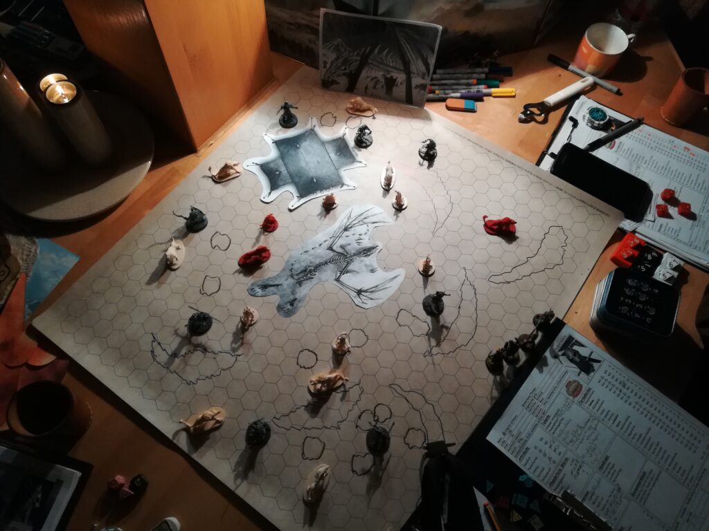So habe ich mal angefangen. Mit der guten alten Chessex Battle Mat (ca. 60cm²) und Chessex Mega Mat (ca. 90cm²) und ein paar non permanent Markern. Dafür habe ich seinerzeit Hexfelder zum Ausdrucken erstellt, mit genau der Anzahl Felder wie bei den Chessex Matten. So konnte man auf Papier schon einmal vorzeichnen. Das System ist puristisch, lässt noch Raum für die eigene Fantasie. Auf dem ersten Foto sieht man noch neutrale Spielfiguren.