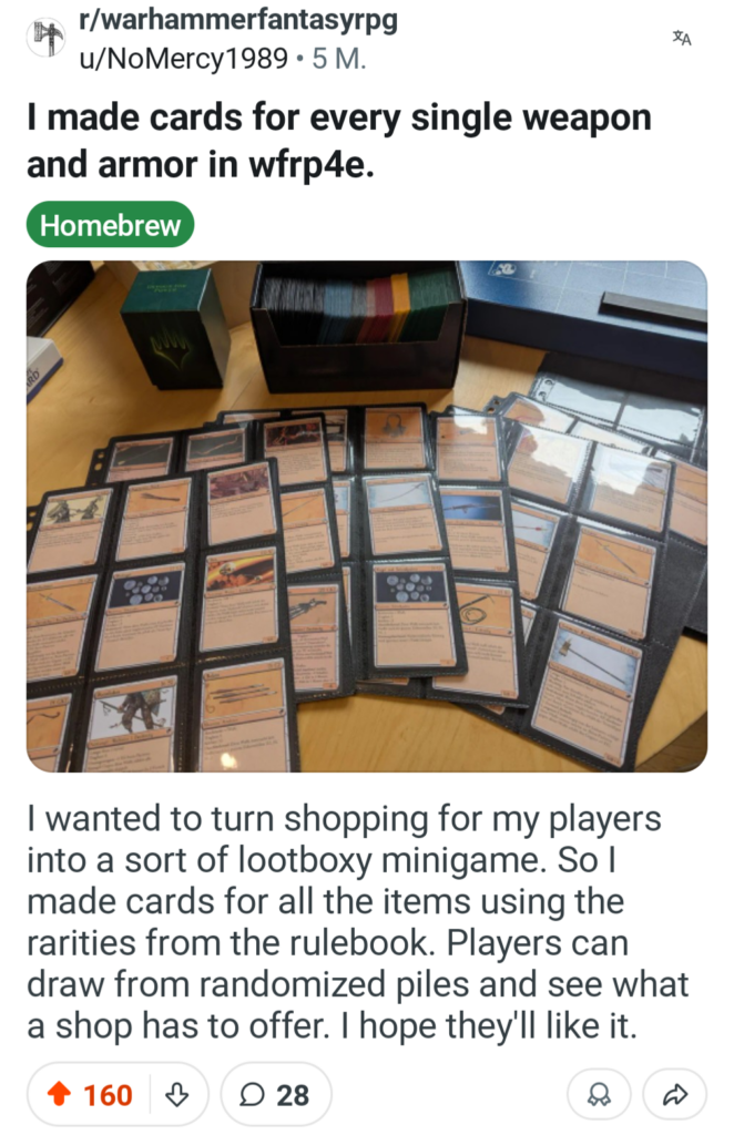 Im Englischen Reddit Channel fürs Warhammer Fantasy Rollenspiel hat der gute nomercy1989 (in unserem Discord aka BabaTimini) ein Kartendeck für WFRP4 geteilt.